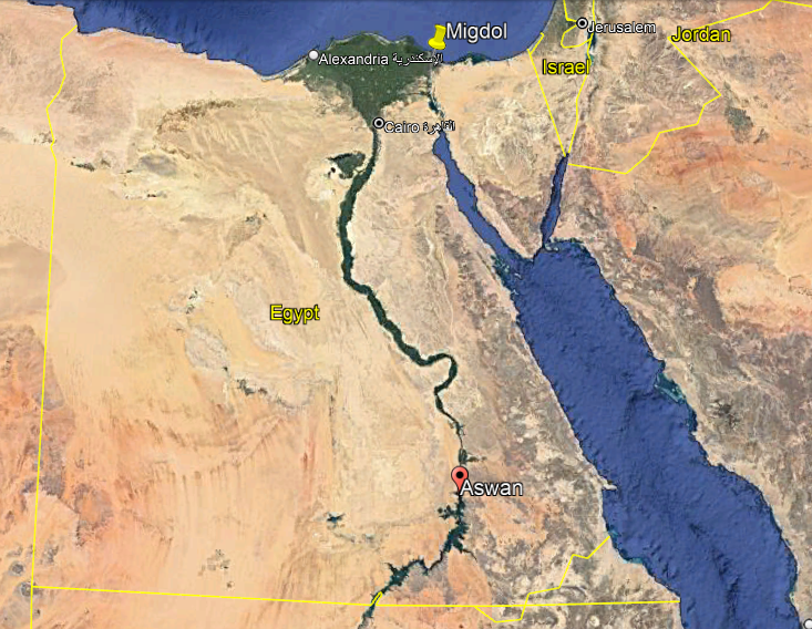 Migdol is bit difficult to place, but it's essentially the northern entry point to the Suez Canal. Aswan, is located in southern Egypt. What's there? The Aswan High Dam. A nuclear attack on this dam to destroy it could radiate the water and the land downstream for years fulfilling this prophecy. It would explain why Egypt is not really mentioned in end-time prophecy as its people would be scattered throughout other nations having abandoned their homes to survive. It would also open the door for Libya to join in and attack Israel as part of the alliance of nations in the War of Gog